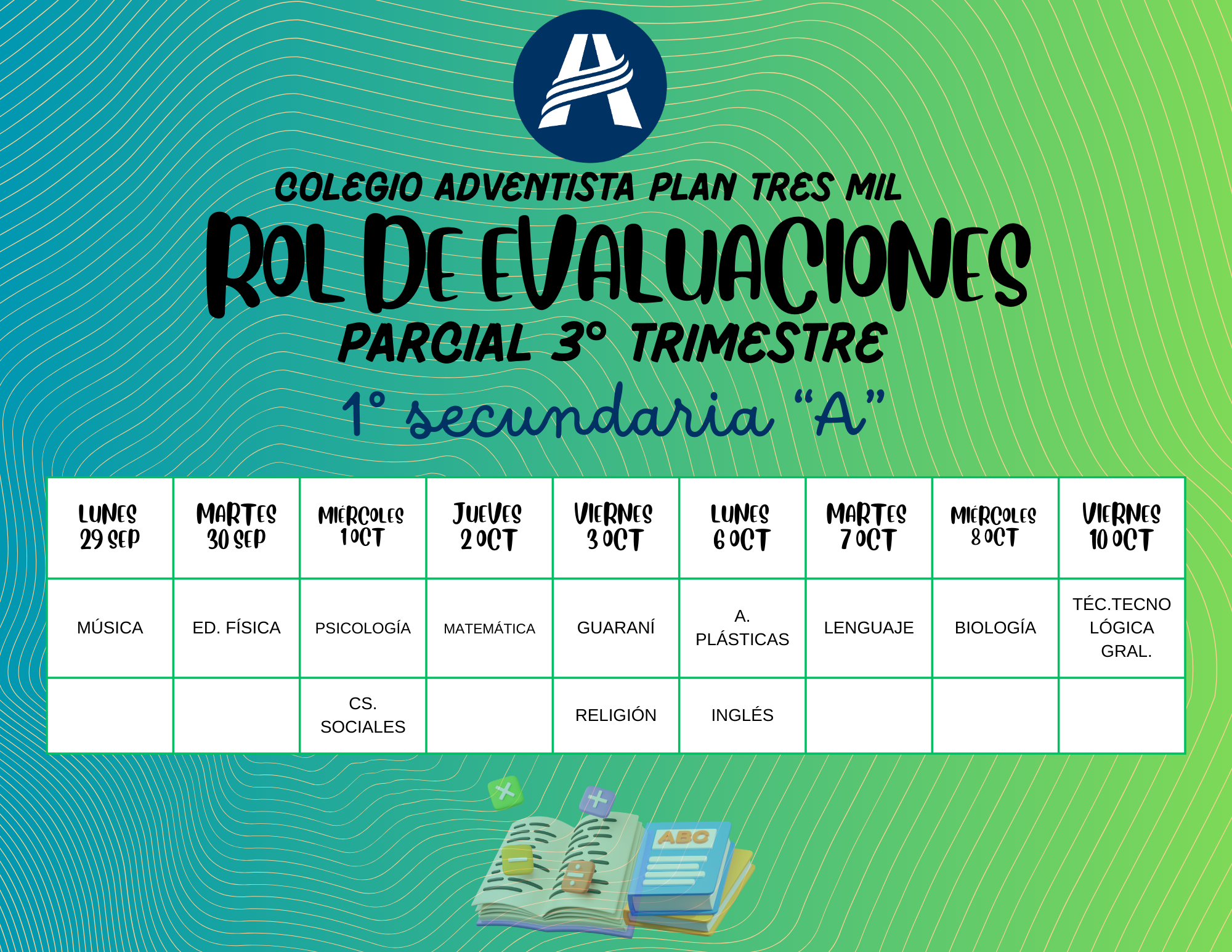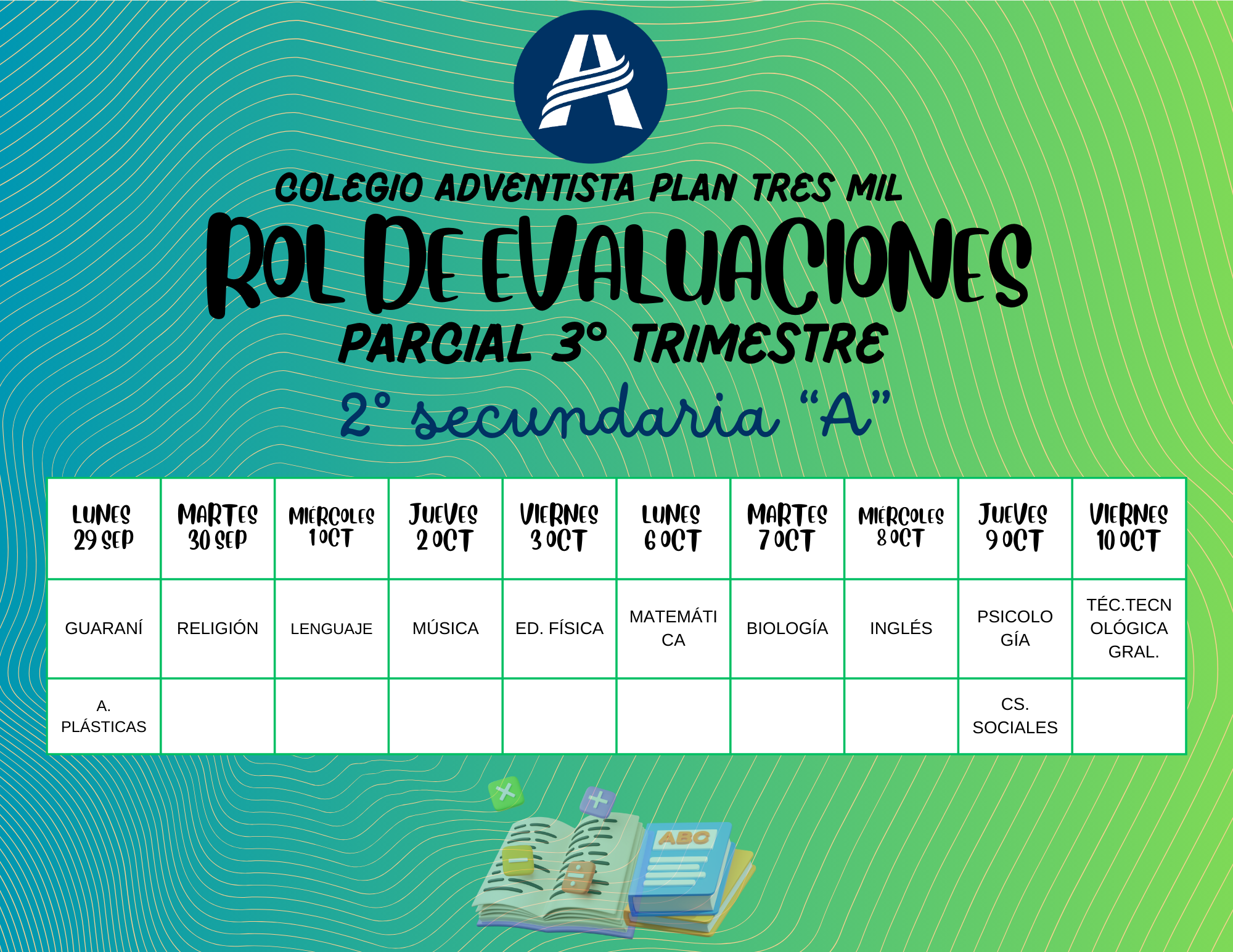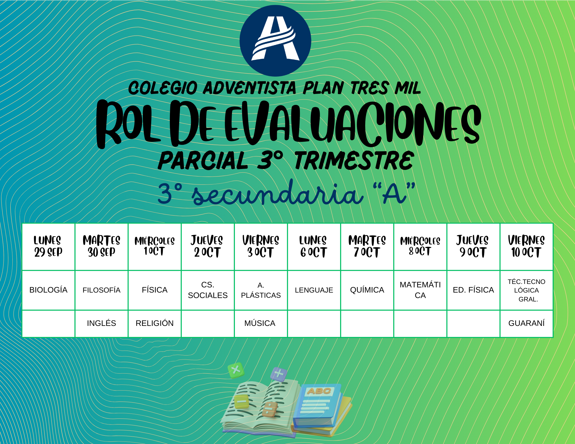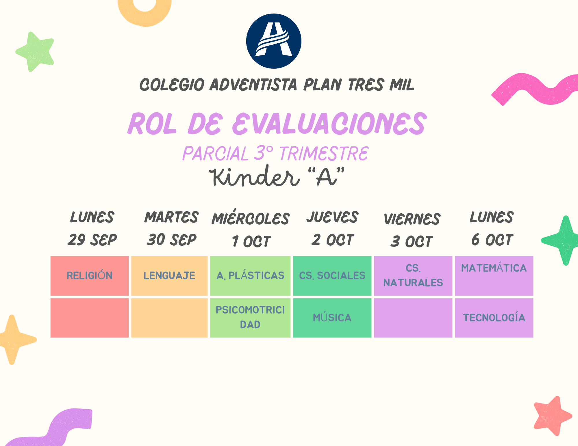 Compartimos con ustedes el Rol de Evaluaciones Parcial del Tercer Trimestre, que se llevará a cabo del 29 de septiembre al 10 de octubre del presente año. A continuación, encontrarán la información detallada por nivel y curso: