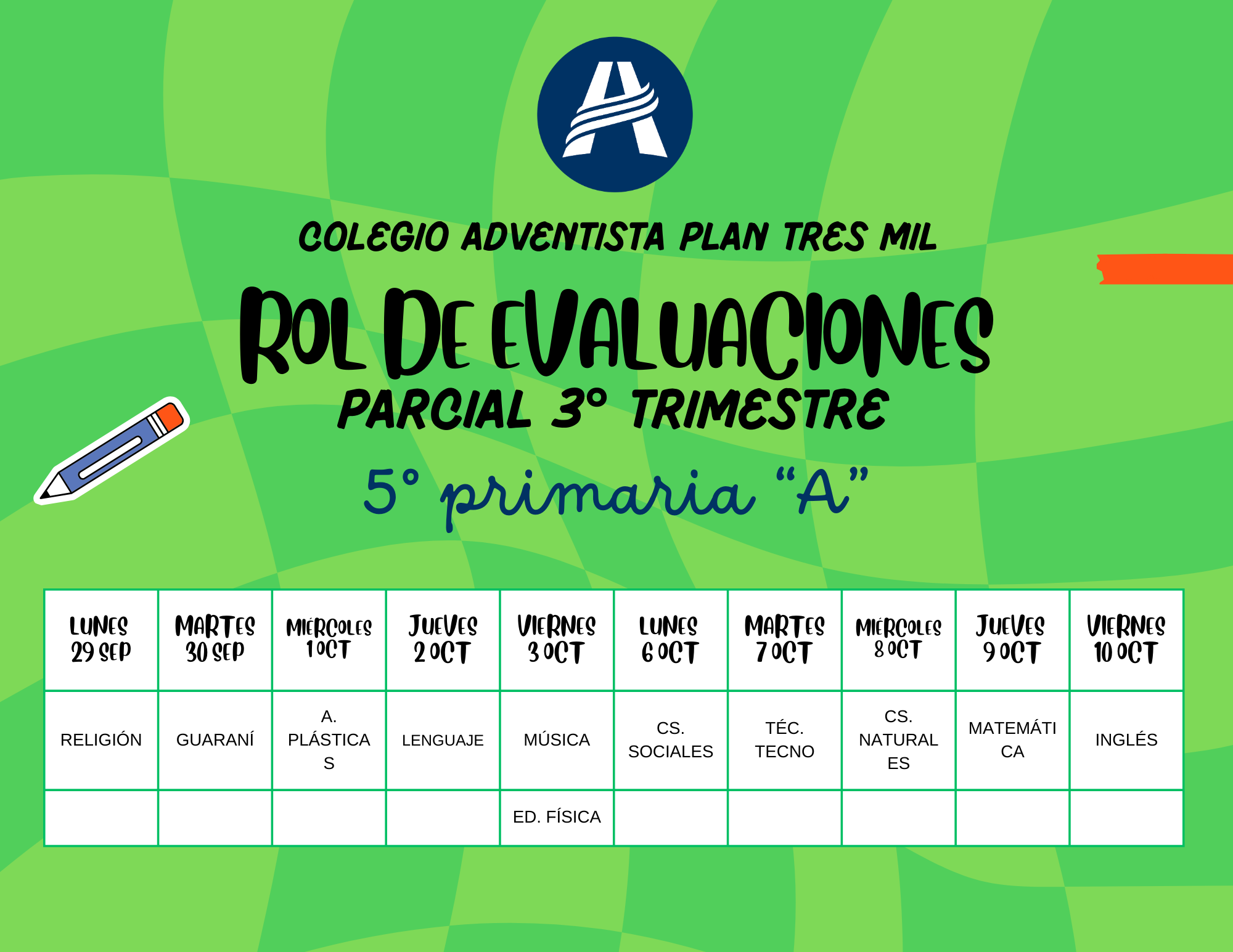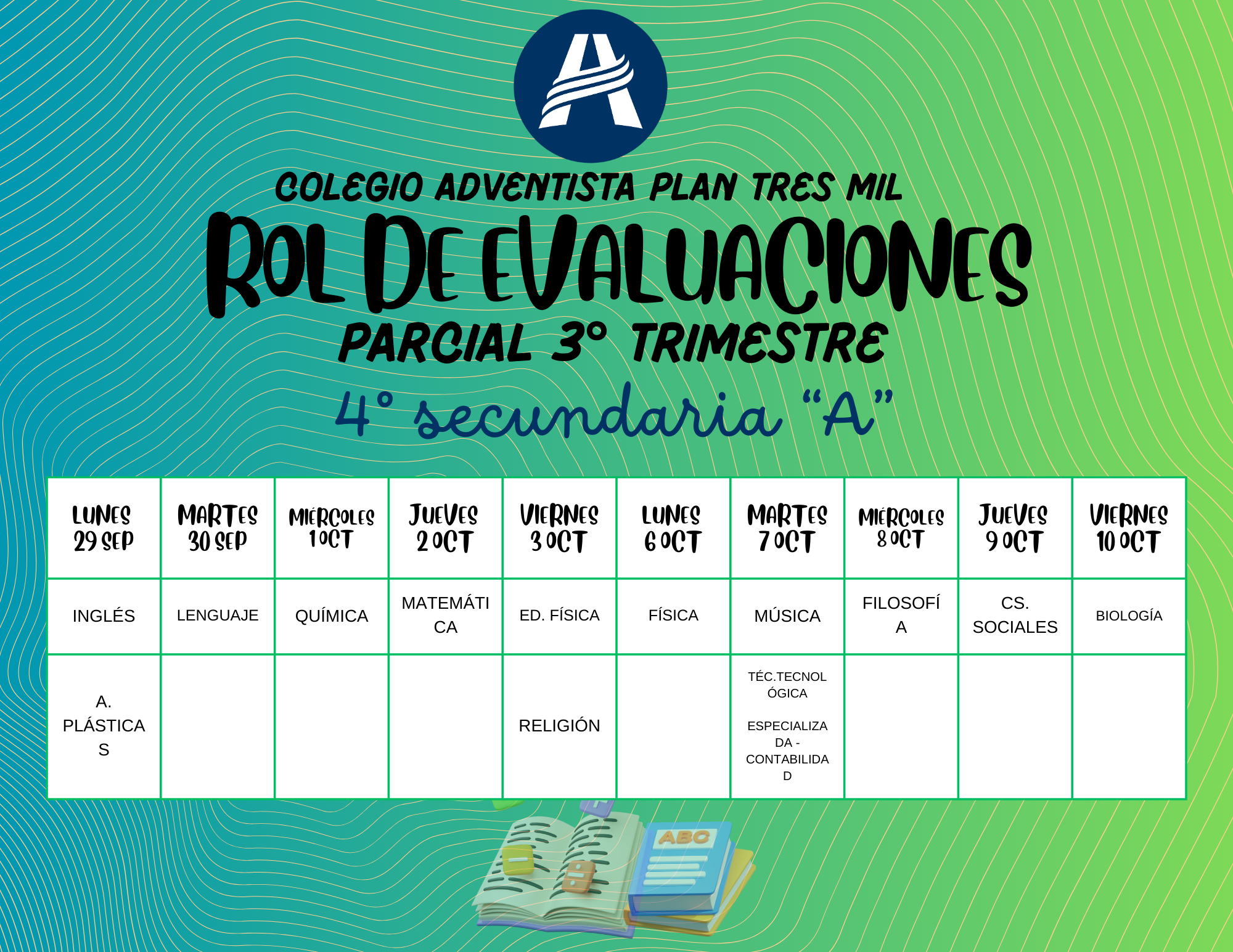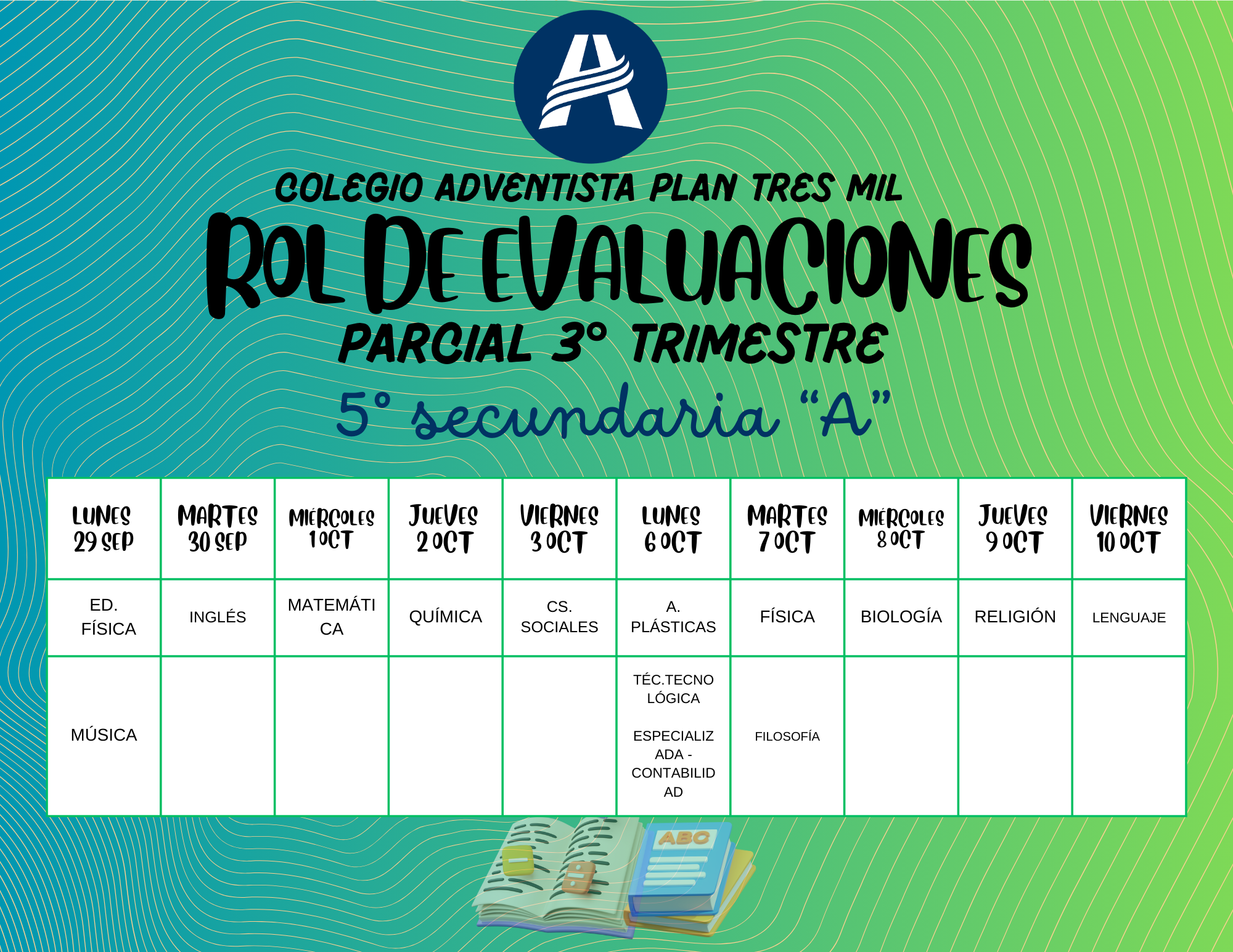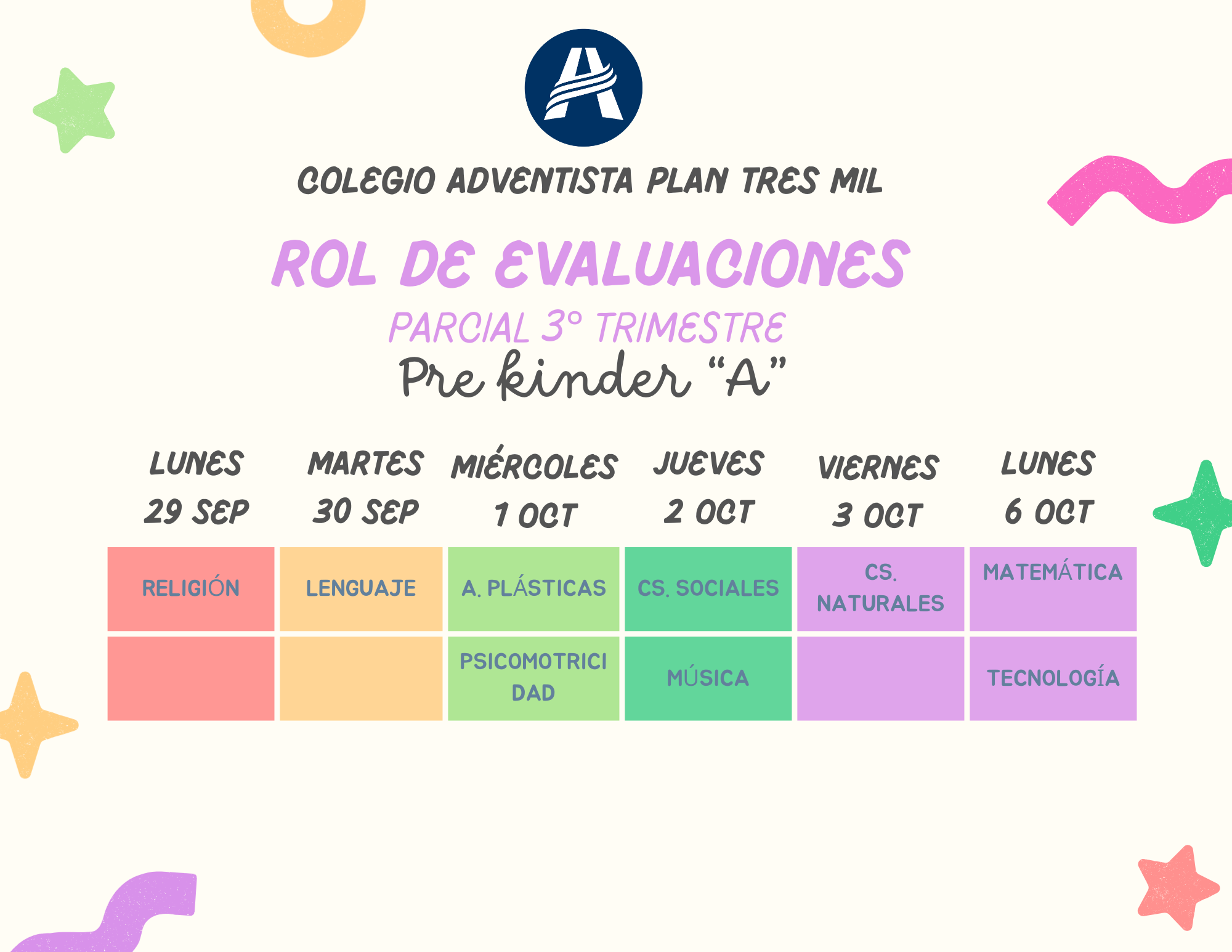 Compartimos con ustedes el Rol de Evaluaciones Parcial del Tercer Trimestre, que se llevará a cabo del 29 de septiembre al 10 de octubre del presente año. A continuación, encontrarán la información detallada por nivel y curso: