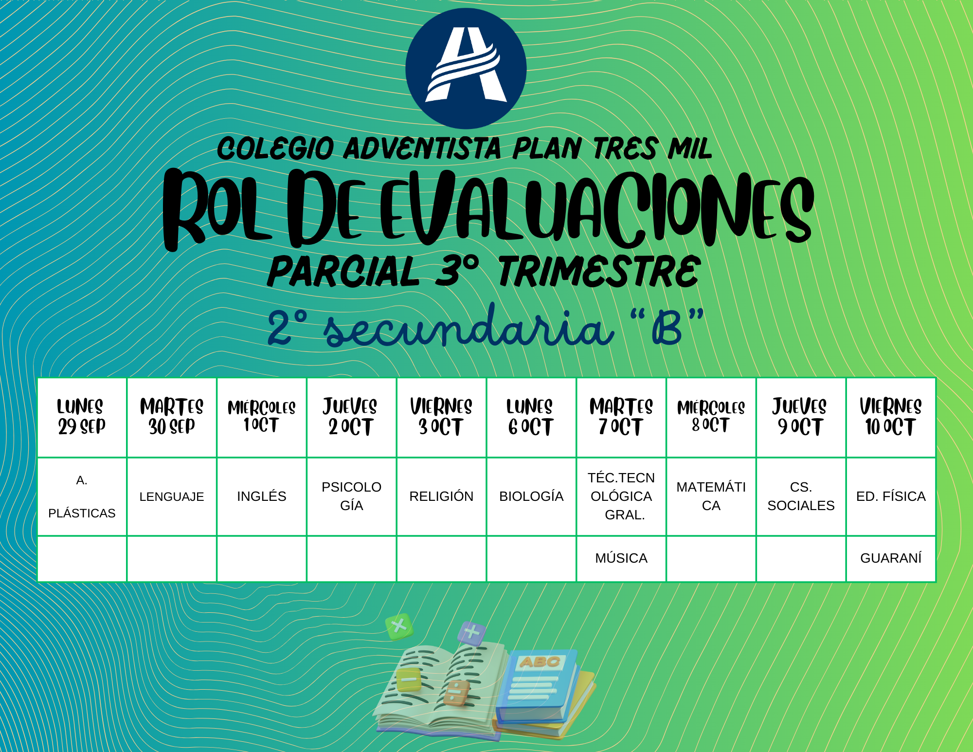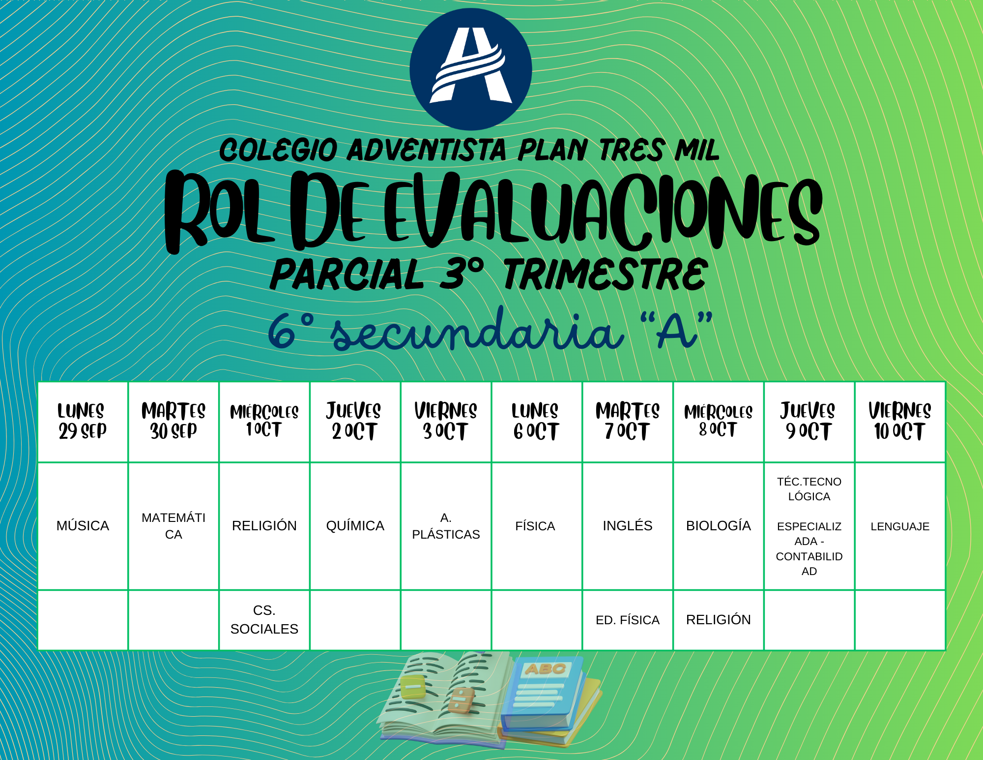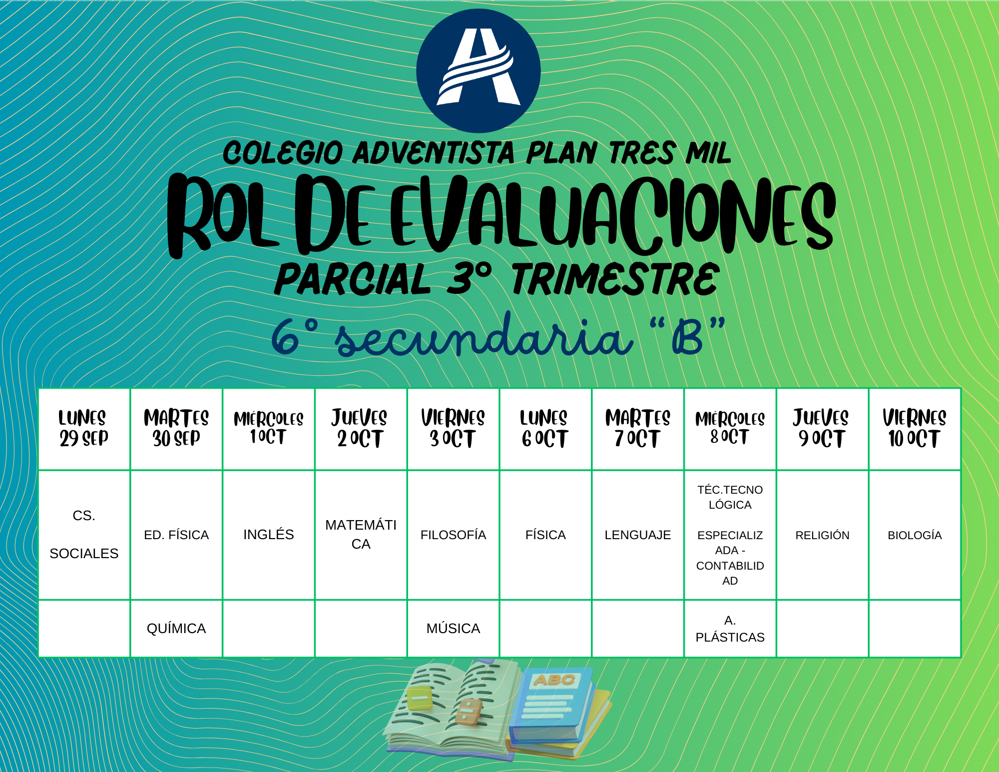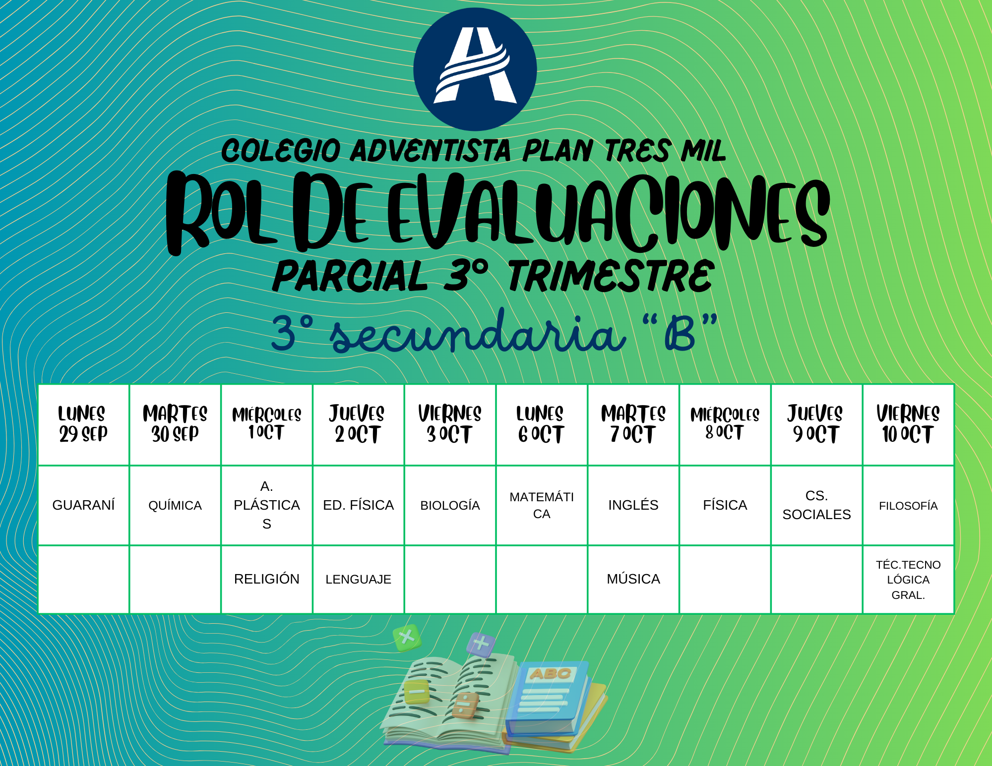 Compartimos con ustedes el Rol de Evaluaciones Parcial del Tercer Trimestre, que se llevará a cabo del 29 de septiembre al 10 de octubre del presente año. A continuación, encontrarán la información detallada por nivel y curso: